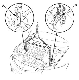 2. Lower the vehicle, attach the chain hoist with the engine hanger stay to the universal lifting eyelet (A) and the transmission hanger (B).
