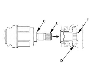 4. Left driveshaft: Insert the inboard end (C) of the driveshaft into the differential (D) until the set ring (E) locks in the groove (F).