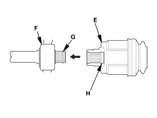 10. Right driveshaft: Insert the inboard end (E) of the driveshaft into the intermediate shaft (F) until the set ring (G) locks in the groove (H).