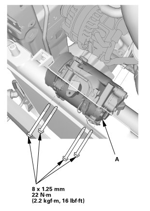 NOTE: Be careful not to damage the radiator fins when removing the A/C compressor.
