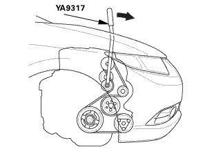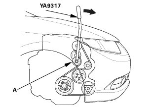 1. Move the auto-tensioner (A) using the belt tension release tool in the direction of the arrow to relieve tension from the drive belt, then remove the drive belt.