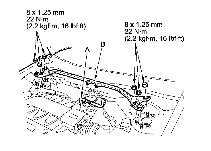 1. Disconnect the brake booster vacuum hose (A) from the strut brace (B).
