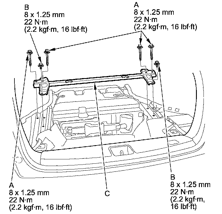 2. Remove the bolts (A, B) securing the rear cargo support (C), then remove the support.