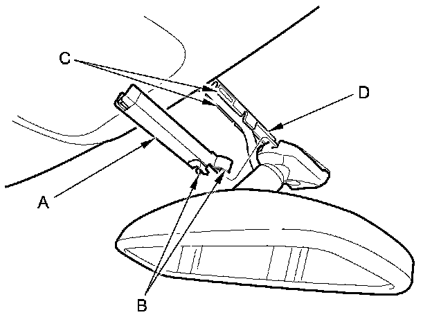 3. Release the cover from the hooks (C) of the rearview mirror harness cover base (D).