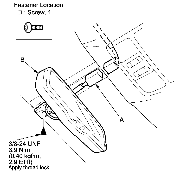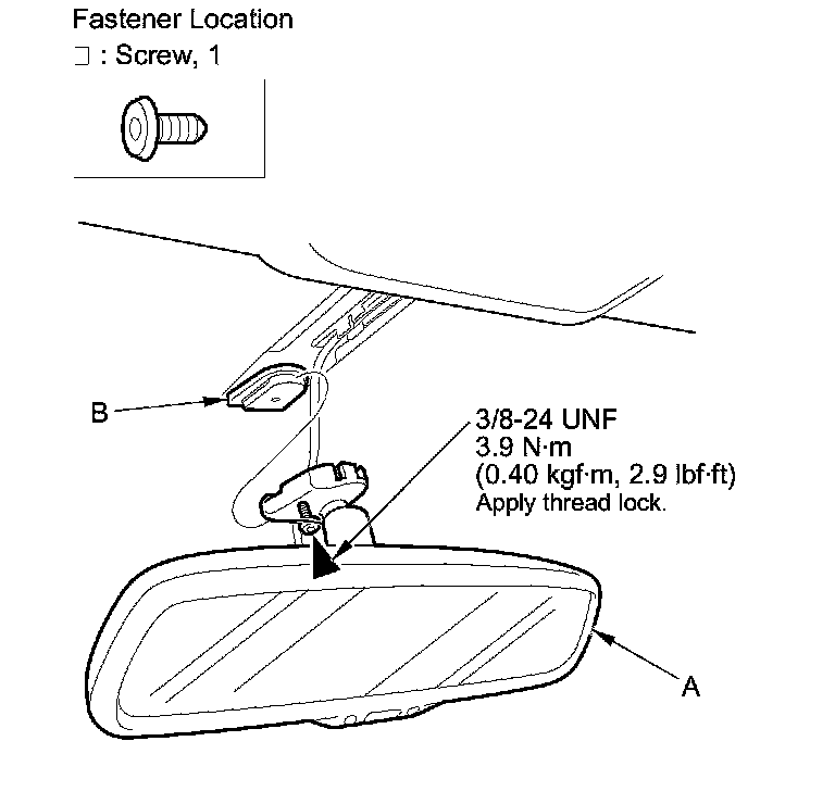 3. Loosen the screw with a TORX T20 bit, then slide the rearview mirror (A) rearward and off the mount (B).