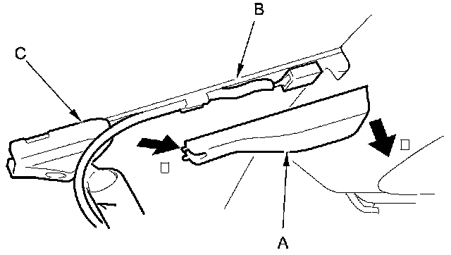1. Slide the rearview mirror harness cover (A) backward, then remove the mirror harness cover from the mirror harness cover base (B) and the base (C).
