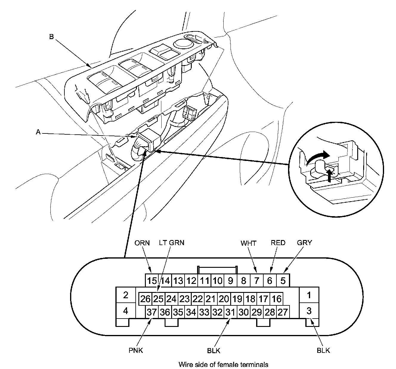 3. Disconnect the 37P connector (A) from the power window master switch (B).