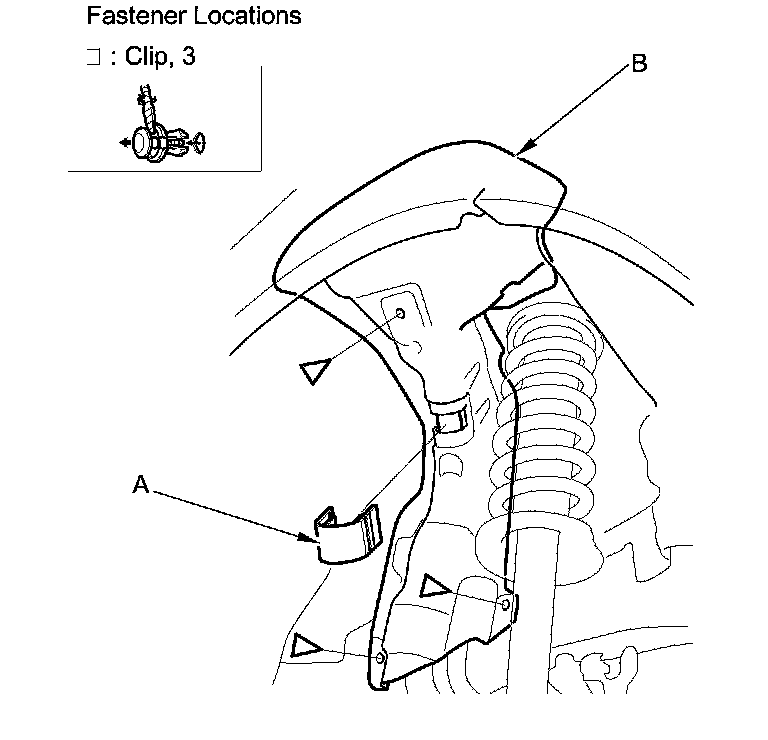 2. Remove the fuel pipe protector clip (A). Detach the clips, then remove the fuel pipe protector (B).