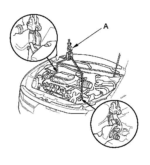 3. Position the engine/transmission under the vehicle. Be sure that they are properly aligned. Carefully lower the vehicle until the engine/transmission are properly positioned in the engine compartment. Make sure the vehicle is not resting on any part of the engine/transmission. Support the engine/transmission with a chain hoist (A) and carefully raise the engine/transmission into place.