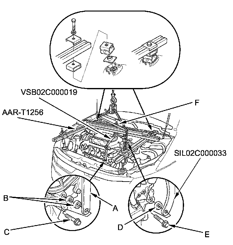 5. Install the engine support hanger (AAR-T1256) onto the vehicle as shown, and attach the hook to the slotted hole in the engine hanger balance bar. Tighten the wing nut (F) by hand, and lift and support the engine/transmission.