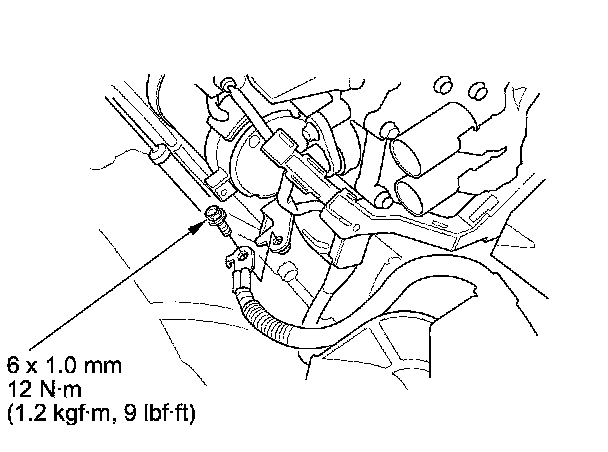 7. Tighten the new upper transmission mount bracket mounting bolts/nut (A) to the specified torque, then install the harness bracket (B).