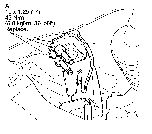 6. Install the new side engine mount bracket mounting bolts (A) into the upper half of the side engine mount bracket. Tighten the bolts to the specified torque.