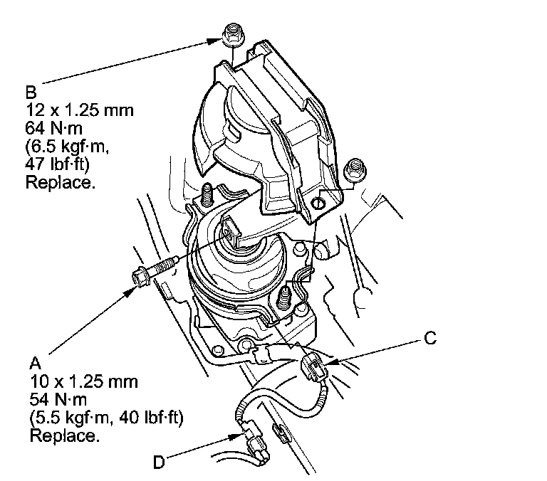 18. Tighten the new front engine mount bolt (A), then install the new front engine mount stop mounting nuts (B), and connect the engine mount actuator connector (C), and install the connector (D) to the front subframe.