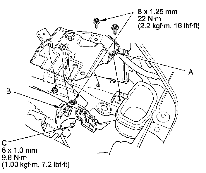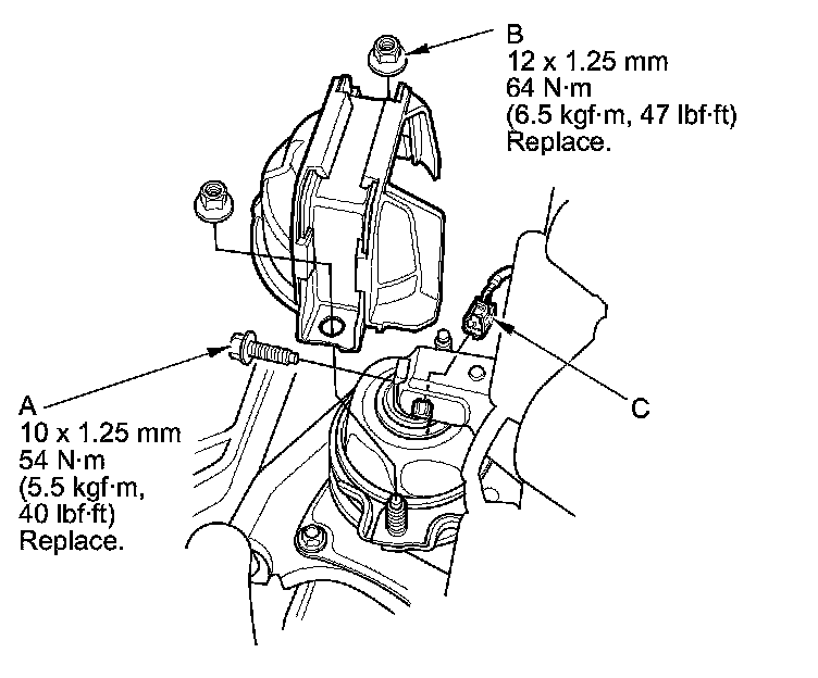 19. Tighten the new rear engine mount bolt (A), then install the new rear engine mount stop mounting nuts (B), and connect the engine mount actuator connector (C).
