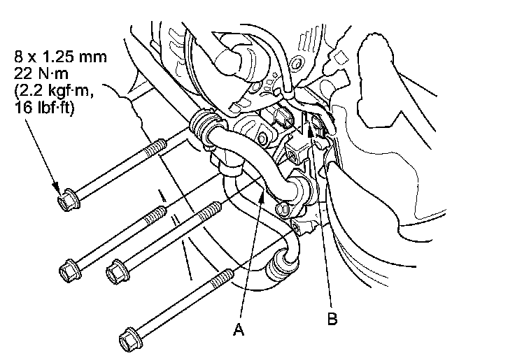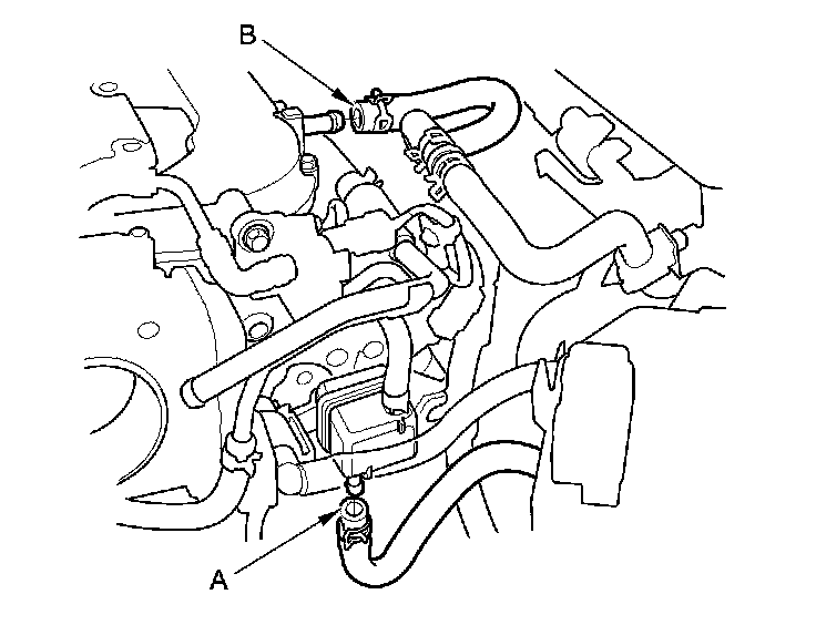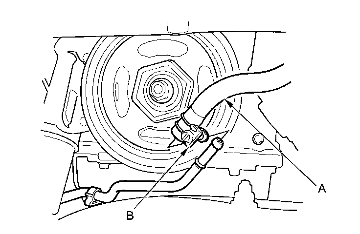 32. Connect the power steering fluid hose (A), then secure the hose with the clamp (B).