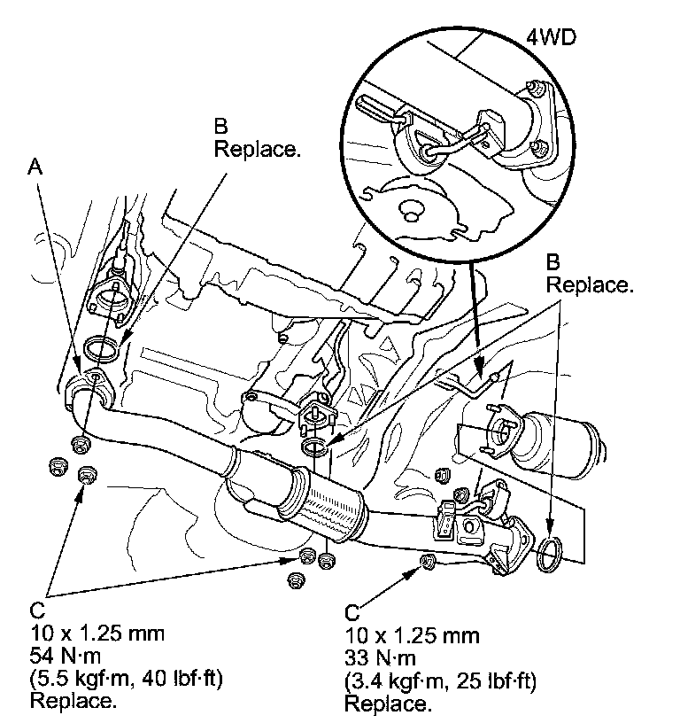 39. Install exhaust pipe A using new gaskets (B) and new self locking nuts (C).