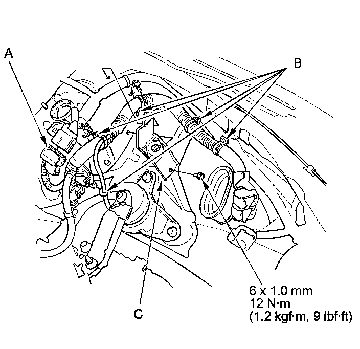 47. Install the power steering pump outlet line (A) and the power steering pump inlet line (B) to the power steering pump and install the power steering hose bracket (C).