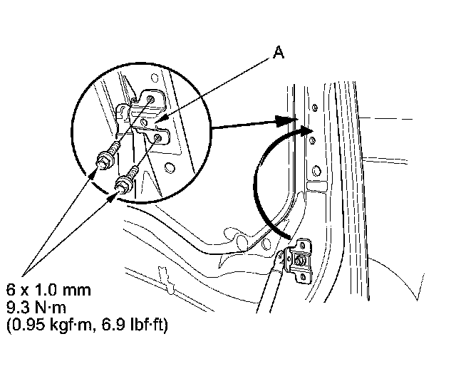 71. Reinstall the driver's side hood support strut bracket (A) with the bolts to proper locations.