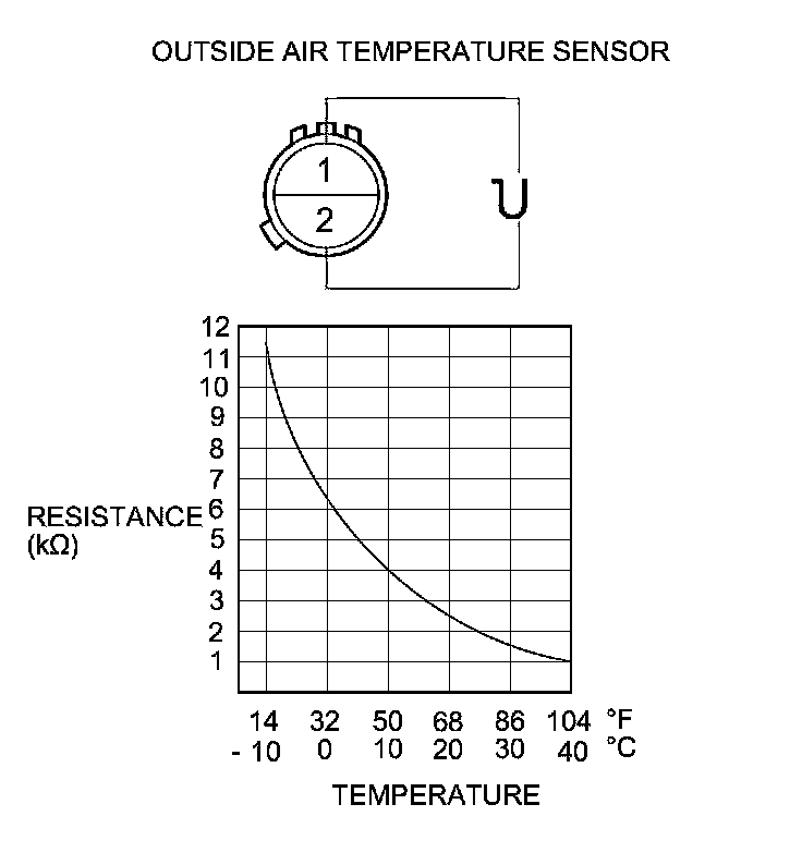 3. Compare the resistance reading between terminals No. 1 and No. 2 of the outside air temperature sensor with the specifications shown in the graph; the resistance should be within the specifications.