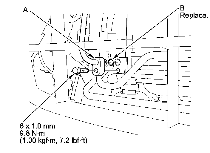 6. Remove the bolt, then disconnect the discharge hose (A) from the A/C condenser. Remove the O-ring (B).