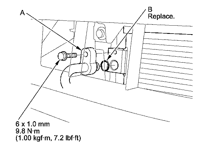 5. Remove the bolt, then disconnect the receiver pipe (A) from the A/C condenser. Remove the O-ring (B).