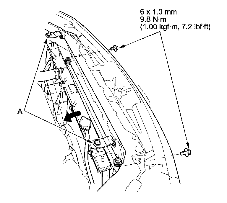 7. Remove the bolts and the A/C condenser upper mount brackets (A).