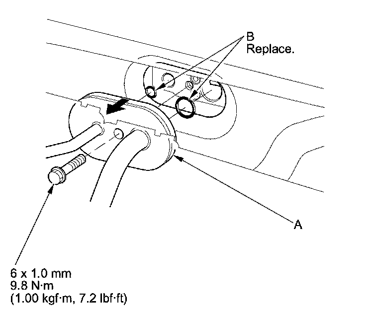 3. Remove the bolt, then disconnect the A/C line (A) from the evaporator core, and remove the O-rings (B).