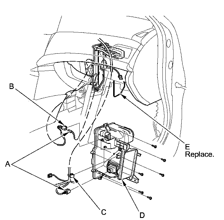 7. Disconnect these connectors (A): The evaporator temperature sensor, and the power transistor. Detach the connector clip (B) and the harness clip (C). Remove the self-tapping screws, the expansion valve cover (D), and the seal (E).
