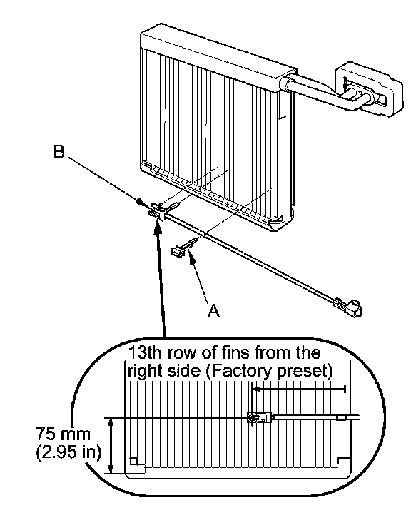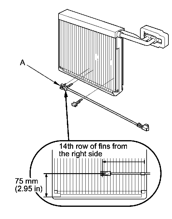 10. When the evaporator temperature sensor (A) is reinstalled onto a new evaporator core, set the evaporator temperature sensor in the 13th fin from the right side.