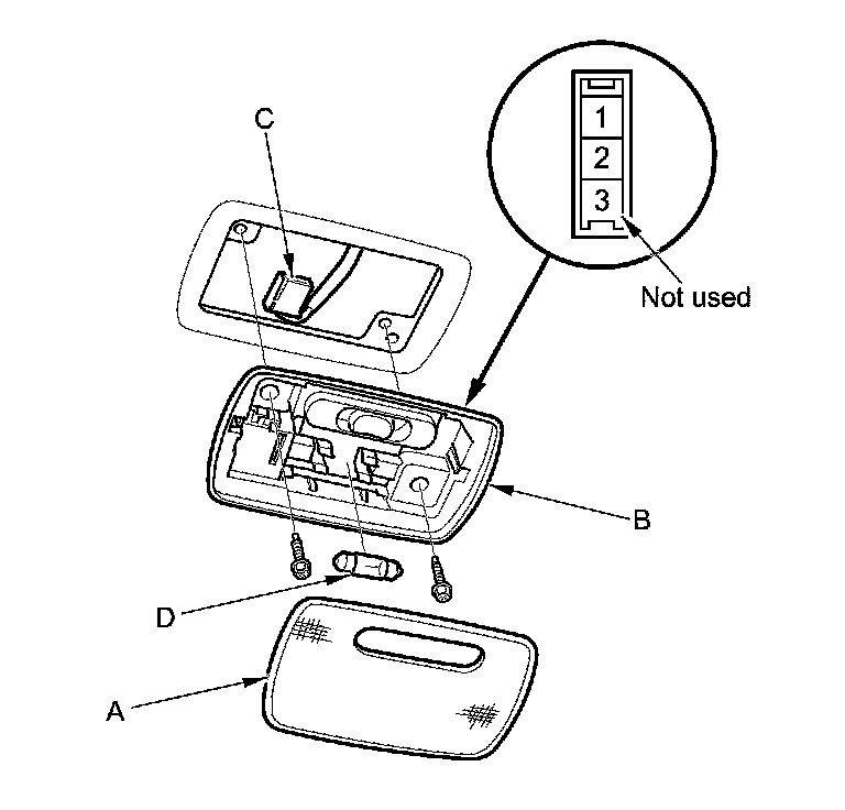 6. If the continuity is not as specified, check the bulb (D). If the bulb is OK, replace the ceiling light.