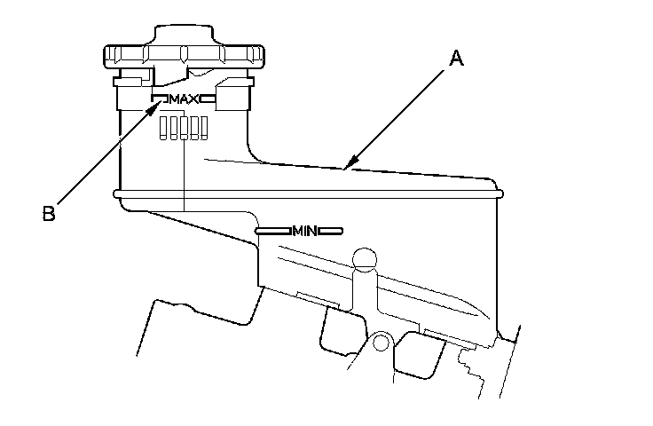 1. Make sure the brake fluid level in the reservoir (A) is at the MAX (upper) level line (B).