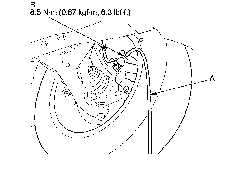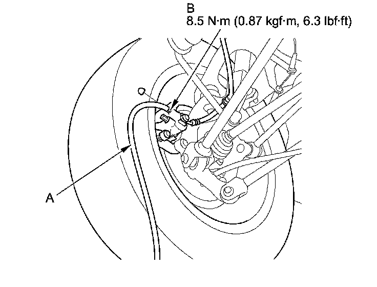 4. Attach a length of clear drain tube (A) to the bleed screw (B), then loosen the bleed screw to allow air to escape from the system. Then tighten the bleed screw securely.