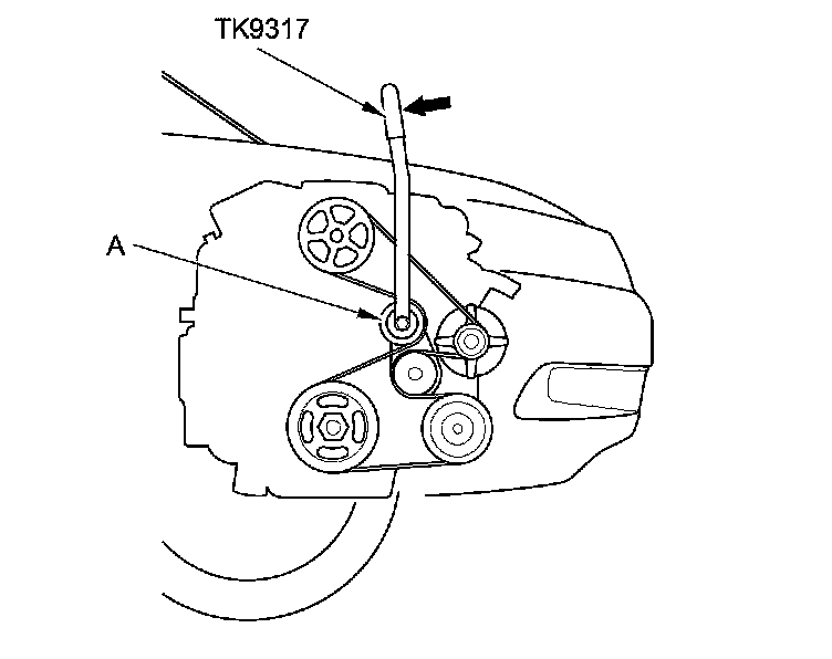 1. Move the auto-tensioner (A) using the belt tension release tool (TK9317) in the direction of the arrow to relieve tension from the drive belt, then remove the drive belt.
