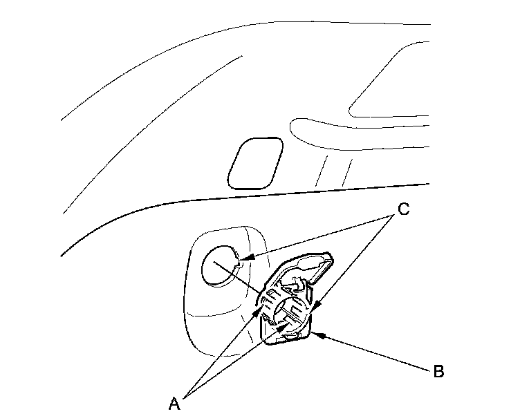 9. Gently press the tabs (A), then remove the housing (B) from the panel. Note the location of the indexing tabs (C).