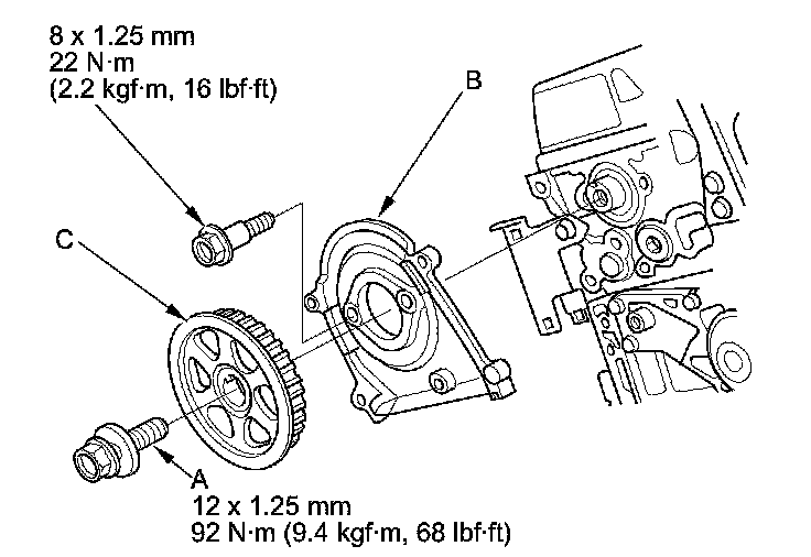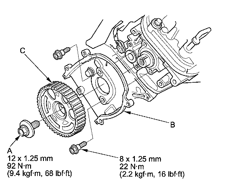 Camshaft pulley mounting bolt (A). Install the back cover (B), then install the camshaft pulley (C).