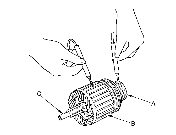 12. Use an ohmmeter to check for continuity between the commutator (A) and the armature coil core (B), and between the commutator and the armature shaft (C). If there is continuity, replace the armature.