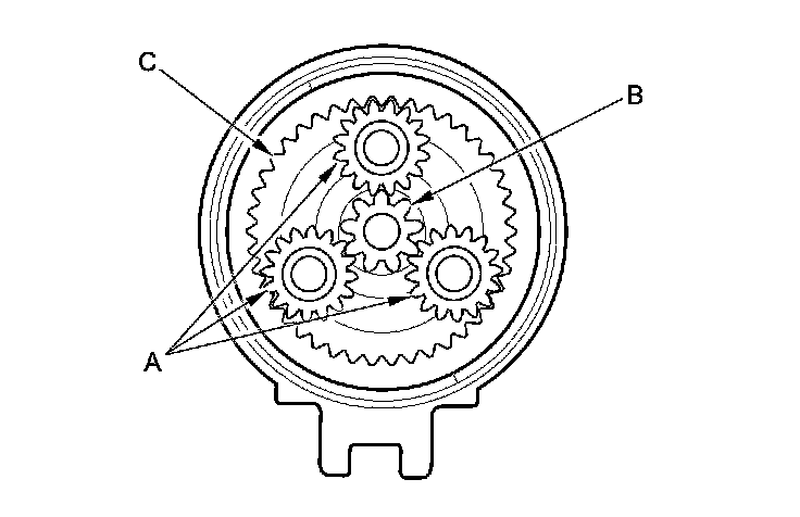 19. Check the planetary gears (A), the armature shaft gear (B), and the internal ring gear (C). Replace them if they are worn or damaged.