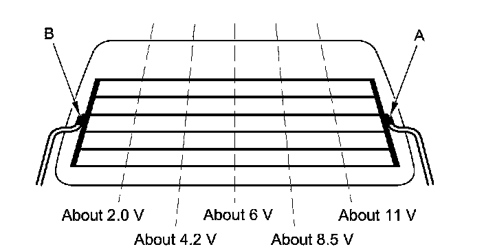 3. Measure the voltage between upper rear window defogger B (1P) negative terminal (B) and body ground. There should be less than 0.2 V.
