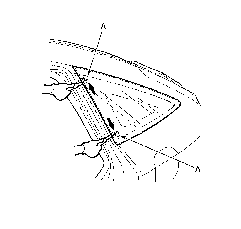 5. With an assistant holding the quarter glass (A), detach the clip with a clip remover from inside the vehicle, then carefully remove the quarter glass.