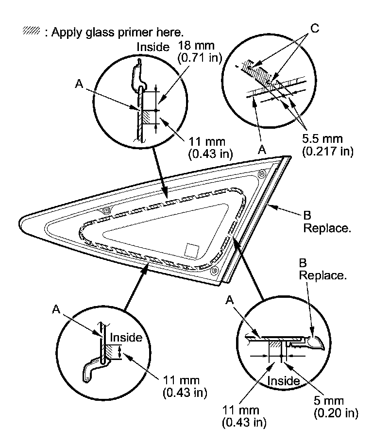 - Apply the glass primer to the rear corner, upper corner, and lower corner area of the quarter glass using the printed dots (C) on the quarter glass as a guide.