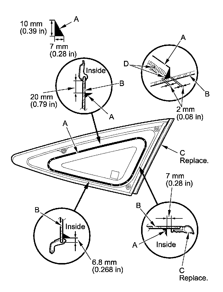9. Attach the new front seal (A) with adhesive tape to the inside face of the quarter glass (B) as shown. Before installing the front seal, apply primer to the inside face of the quarter glass.