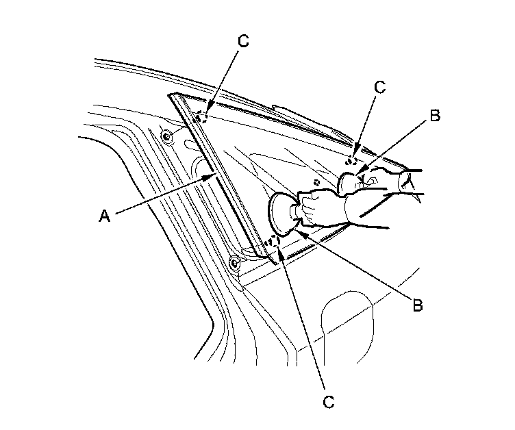 14. Hold the quarter glass (A) with suction cups (B) over the opening, align it with the clips (C), and set it down on the adhesive. Lightly push on the quarter glass until its edges are fully seated on the adhesive all the way around.