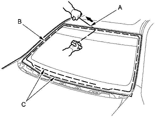 6. With a helper on the outside, pull the piano wire (A) back and forth in a sawing motion. Hold the piano wire as close to the windshield (B) as possible to prevent damage to the body and the dashboard. Carefully cut through the rubber dam and the adhesive (C) around the entire windshield.