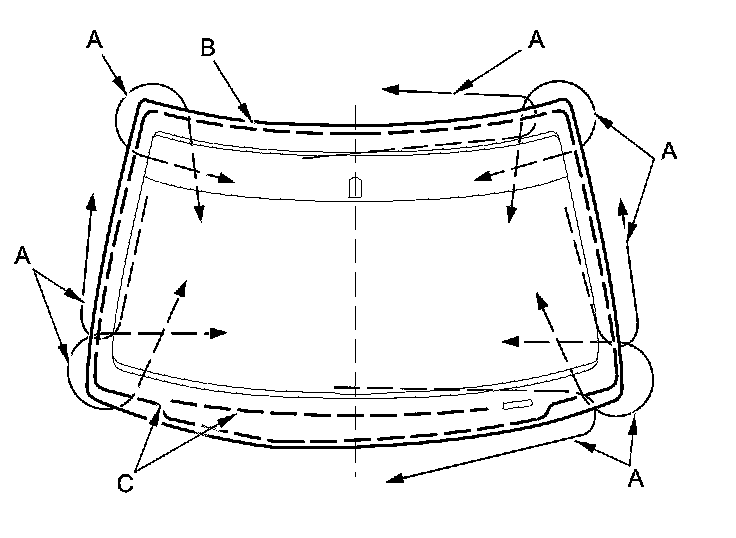 13. Attach rubber dam B with the adhesive tape to the inside surface of the windshield (A) as shown, using the edge of the black ceramic-coated area (C) as a guide: