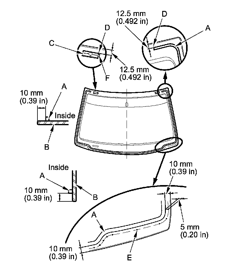 12. Apply glass primer to the upper clips mounting area on the windshield (B), and let it dry. Remove the adhesive backing and attach rubber dam A and the upper clips (C) to the inside of the windshield as shown: