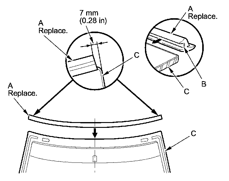 14. Attach the windshield molding (A) with the adhesive tape (B) to the upper edge of the windshield (C).