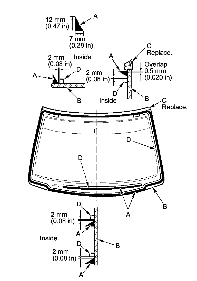 21. Put the cartridge in a caulking gun, and run a continuous bead of the adhesive (A) around the windshield (B) along the edge of the windshield molding (C) and the rubber dams (D) as shown: