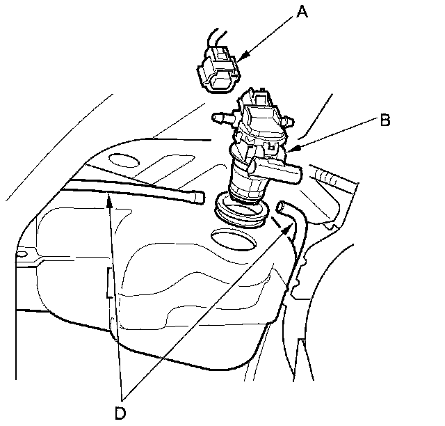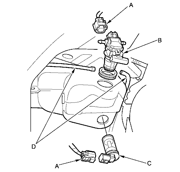 3. Disconnect the washer tube (D), then if necessary, remove the washer motor and the washer fluid level switch (Canada models).