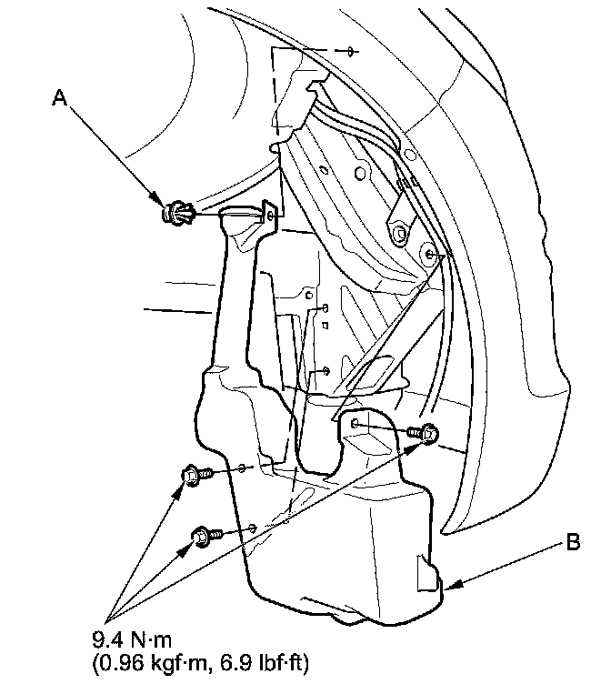 4. Remove the clip (A) and three bolts from the washer reservoir (B).