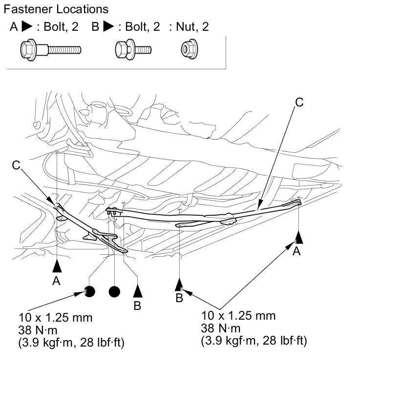 2. Remove the bolts (A, B) and the nuts, then remove the trailing arm braces (C) from the body.
